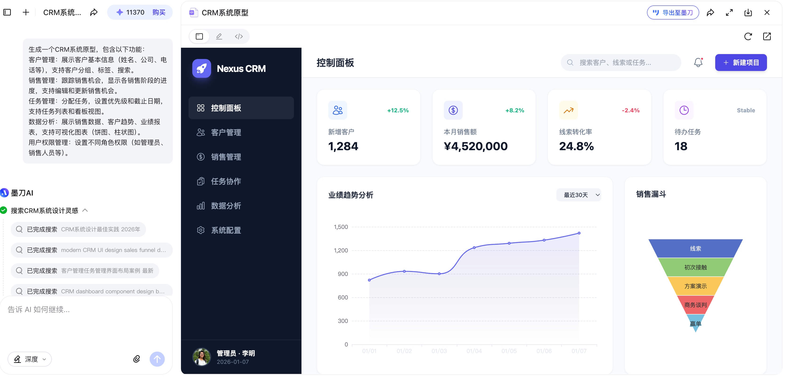 这时候,你的这套原型已经是真实点击演示的CRM系统雏形了。从接到需求到拿出这套可交互的方案,全过程可能也就5-10分钟。哪怕你是刚入行的B端产品新人,只要掌握了这套AI生成CRM系统原型的方法论,也能瞬间拥有资深PM的出图速度。