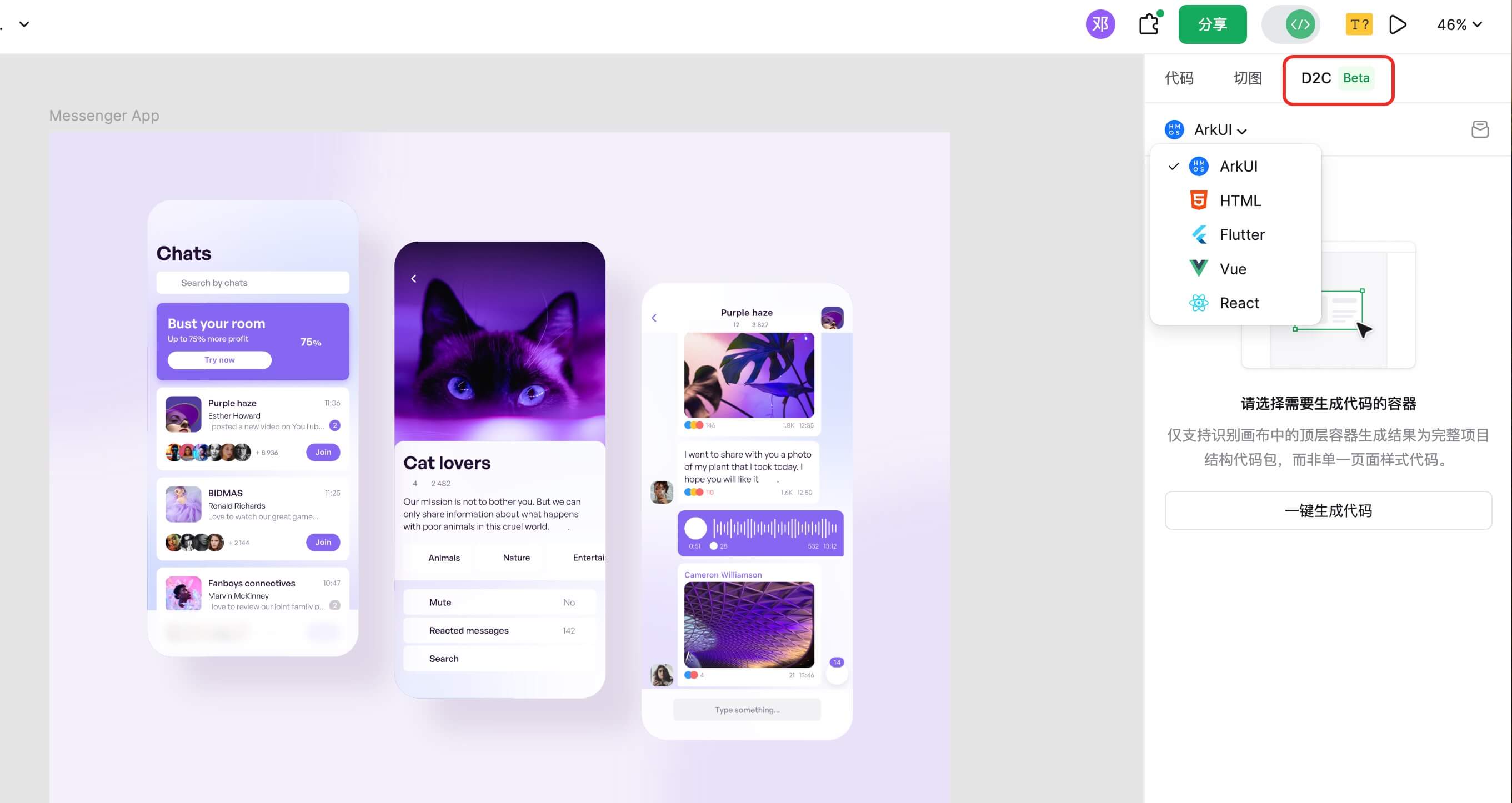 接下来,进入工作台的编辑界面,点击右上角的研发模式图标,进入研发模式。在研发模式下,点击D2C标签,选择你需要的代码格式,点击下方的「一键生成代码」按钮,就可以转换了。点击免费注册体验D2C设计稿转代码!