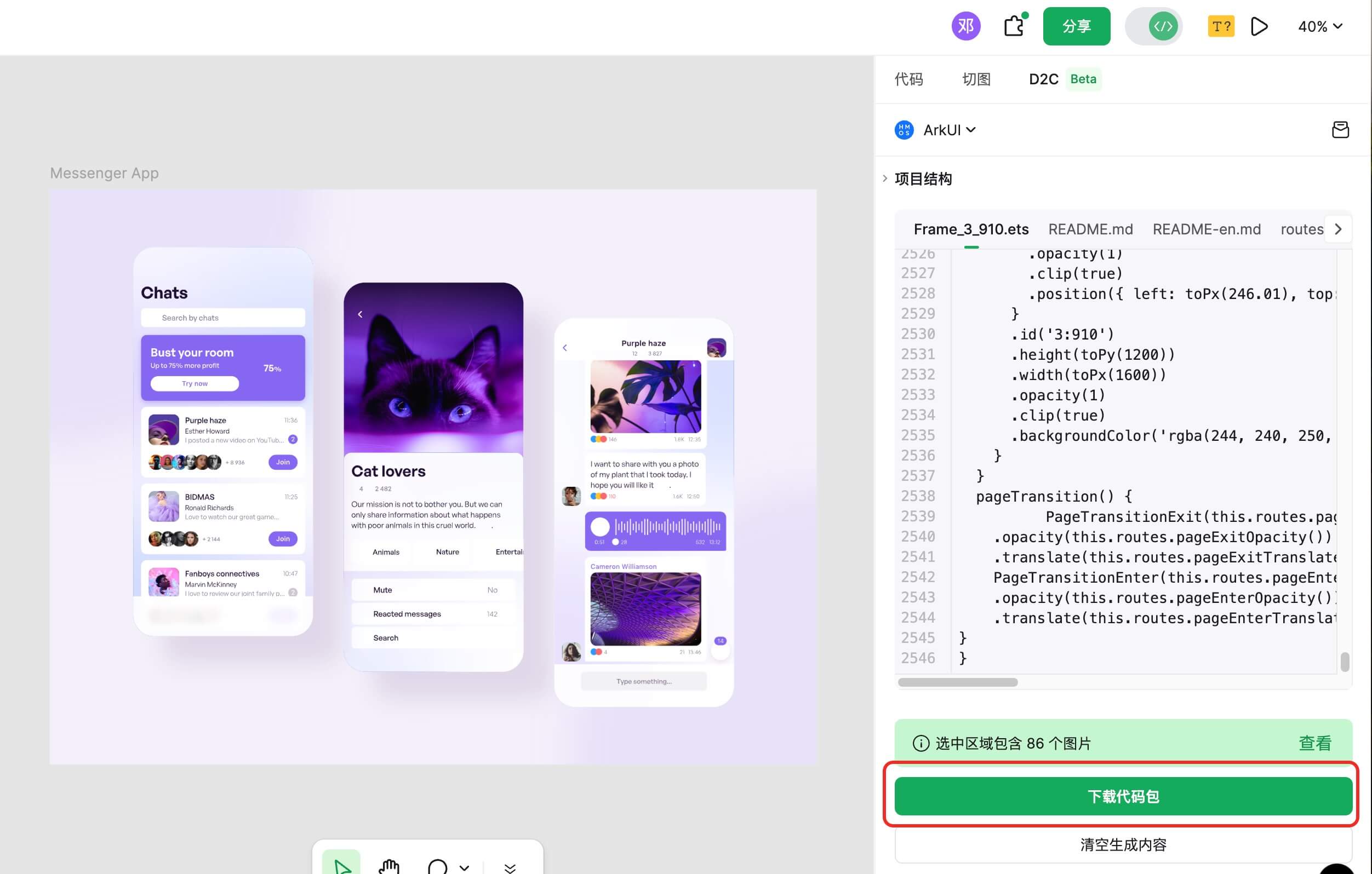 代码转化完成后,你可以在右侧面板中看到生成的代码。只需要下载代码包到本地,即可开始使用。整个过程既简单又高效,让你的设计到开发的转换更加顺畅。