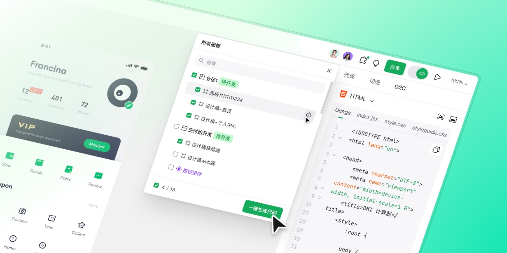 D2C全称为Design to Code,顾名思义,就是从设计直接生成可用代码的模式。通过D2C,设计稿不再只是静态图片,而是可以一键转换为前端可识别的代码片段,减少人工切图、标注和反复沟通的环节,让设计稿直接服务于开发,实现设计即生产的理念。